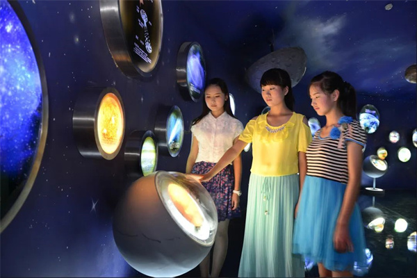 展廳中央的內(nèi)投影演示從宇宙大爆炸到銀河系,太陽系的形成過程,其中以地球知識(shí)為重點(diǎn)。現(xiàn)在,我們有沒有仿佛漂浮在浩瀚的宇宙之中的感覺?