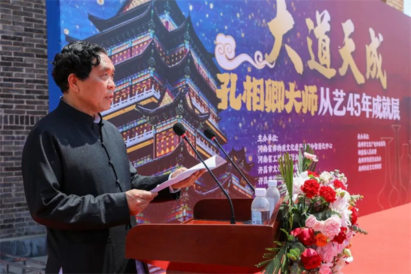 首先,許昌市文化廣電和旅游局黨組書記、局長李紹英向來自全國各地前來參加慶典活動的嘉賓朋友表示熱烈的歡迎和誠摯的感謝!同時也?紫嗲浯髱熒湛鞓!孔相卿大師生在神垕、長在神垕,是神垕的大地撫育了孔相卿,是神垕的資源成就了孔相卿,鈞瓷燒制技藝國家級非遺代表性傳承人孔相卿將科學應用于鈞瓷創(chuàng)作過程中,他創(chuàng)造的“一器多法、以器定法”的現(xiàn)代工藝,實現(xiàn)了生產(chǎn)工藝的重大突破,他發(fā)明的“銅系青藍釉”及“銅系金彩紅”更是科技與藝術結合的典范,這些作品代表了當代鈞窯的巔峰之作。