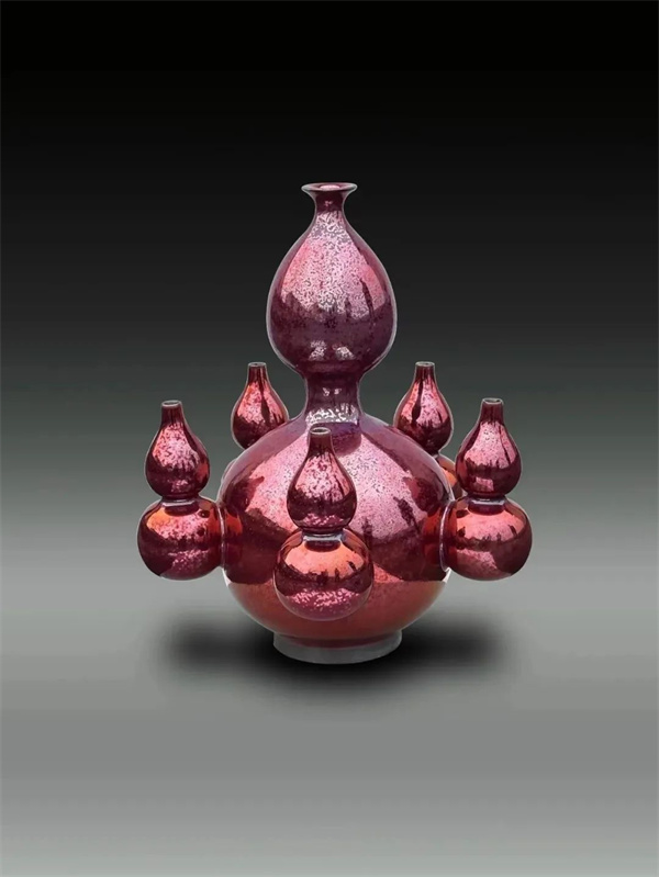 此次更是“鈞窯銅系金紅釉”首次發(fā)布,銅系金紅釉,經(jīng)過數(shù)年攻關,創(chuàng)造性地用銅的氧化物替代黃金作為著色劑,在還原氣氛下燒制成功,革命性地將鈞瓷色彩推進到陶瓷美學新境界,銅系金紅釉作品色彩飽滿,金光燦爛,厚重貴氣,視覺沖擊力強,給人一種高貴富麗的美學愉悅感。