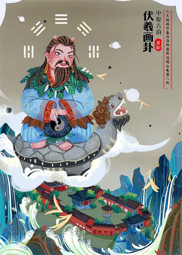 早在6500年前,人文始祖太昊伏羲氏建都宛丘(今淮陽),在蔡水得白龜一只,于畫卦臺前以白龜池蓄養(yǎng)。閑暇之時,常臨池觀看,從白龜龜紋得到啟發(fā)而畫出了先天八卦。采用歷史典故及畫卦臺景點(diǎn)作為繪畫元素,不僅突出了淮陽深厚的文化底蘊(yùn),也表現(xiàn)了淮陽現(xiàn)在的文化發(fā)展變化。