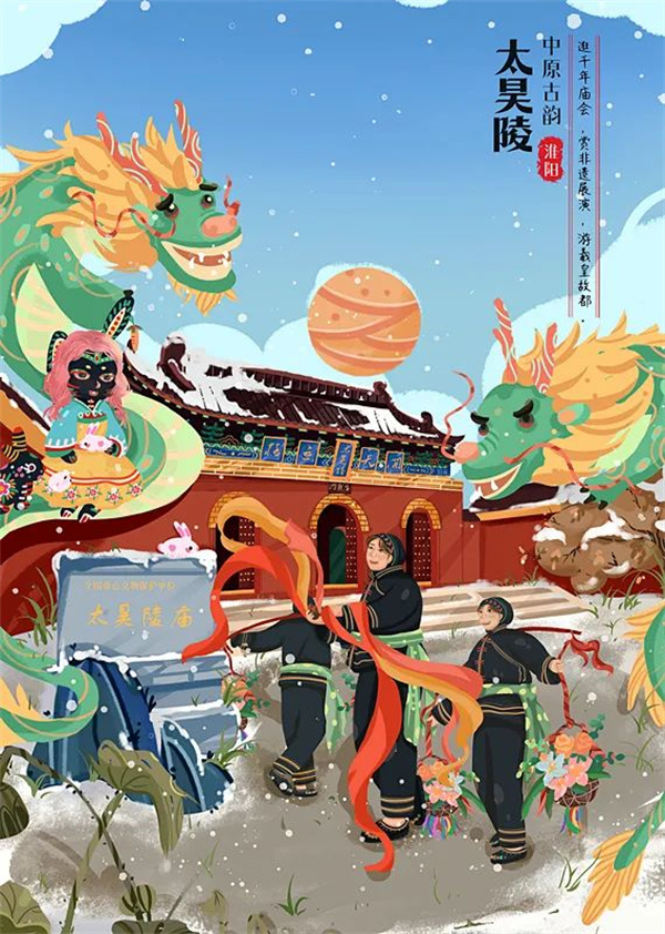 伏羲雕像、太昊陵統(tǒng)天殿、泥泥狗、荷花。
