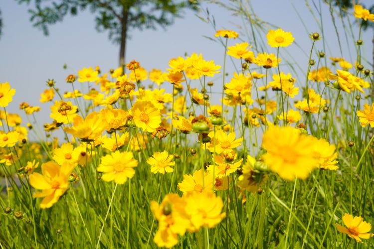 金雞菊花色金黃明媚,花朵順著枝干昂揚(yáng)向上開放,花瓣一片片嬌小可愛,沿著河堤鋪散開來,像一條金色的地毯,在陽光的照耀下,格外美麗。