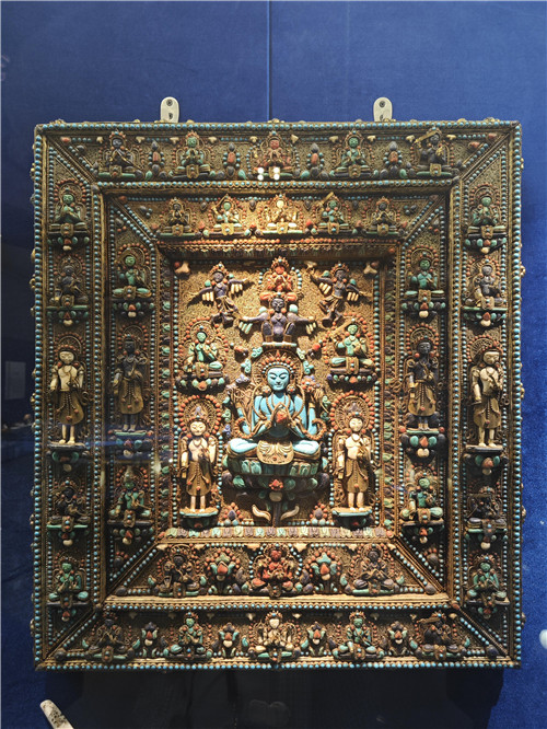 佛板底層采用傳統(tǒng)的卡絲工藝,鑲嵌有硨磲、綠松石、青金石、珊瑚四種珍貴寶石,用材考究,工藝精湛,構(gòu)思巧妙,看一眼就覺得美輪美奐、富麗堂皇。