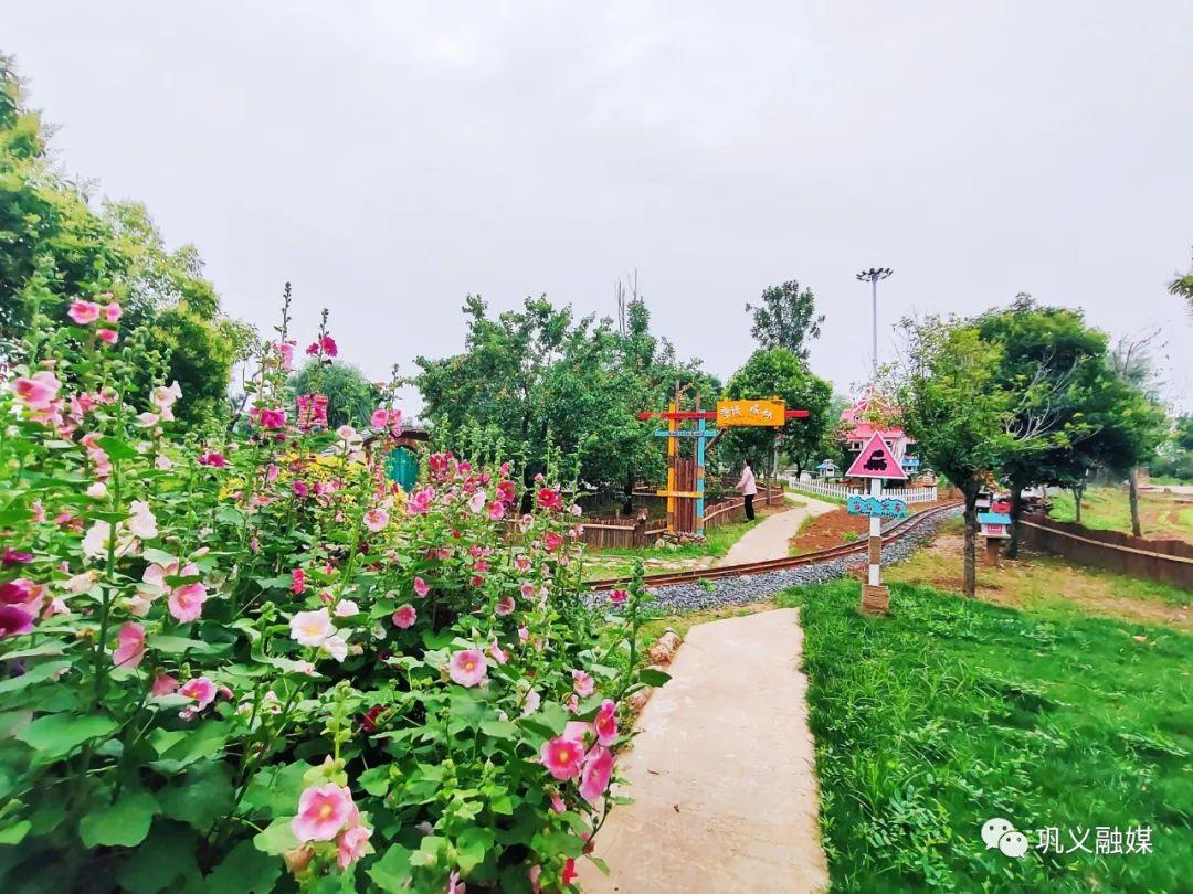 整潔的草坪與茂密的果樹(shù)相映襯,小火車、蘑菇屋、露營(yíng)帳篷等穿插在一處處如畫(huà)景觀中。村民們帶著草帽,拿著小鋤頭,正在規(guī)劃好的田地里對(duì)辣椒苗、南瓜苗等進(jìn)行管理......