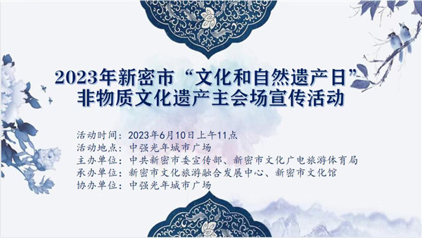 新密市2023年“文化和自然遺產(chǎn)日”非遺宣傳展示系列活動將于6月10日在中強(qiáng)光年城市廣場正式啟動,今年活動的主題為:“加強(qiáng)非遺系統(tǒng)性保護(hù) 促進(jìn)可持續(xù)發(fā)展”,口號是“加強(qiáng)非遺保護(hù)傳承 守護(hù)共有精神家園”“講好中國非遺故事 深化文明交流互鑒”。