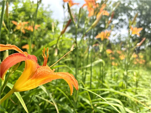 金雞菊是熱烈的,萱草花則多了一絲樸實(shí)親切,花形似百合,每一枝花萼上有多個(gè)花蕾,黃花灼灼,盛放枝頭,讓人沉醉其中,見(jiàn)之忘憂。
