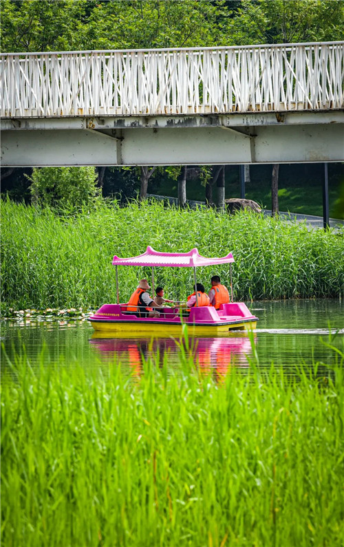 劃著游船感受清風(fēng)徐來(lái),沿著木棧尋找蛙聲?shū)B(niǎo)鳴,放松心情,尋得一時(shí)的愜意與自然。