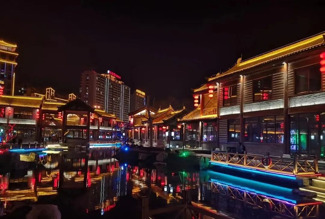 待到日沉月升,古鎮(zhèn)燈光亮起,又是另一番景象。串串燈籠照亮街道,蜿蜒的河水映著熠熠彩燈,這美景,怎么拍都出片呀!