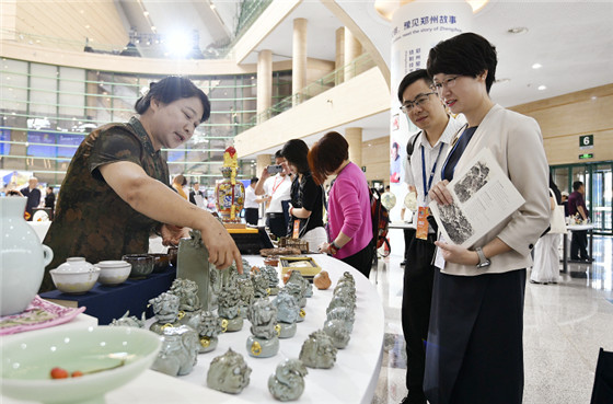 “羅山皮影戲是國家級(jí)非物質(zhì)文化遺產(chǎn),演唱時(shí)真假聲轉(zhuǎn)換自如,唱詞詼諧幽默……”在羅山山妞皮影戲的展會(huì)前,來自羅山縣潘新鎮(zhèn)祁家村的祁平正在為嘉賓展示戲曲皮影。非遺表演互動(dòng)展示區(qū)陳設(shè)了青銅器制作技藝、羅山皮影戲、剪紙、鄭州窯陶瓷燒制技藝、唐三彩燒制技藝、汝瓷、銀飾鍛制技藝(夢祥銀)、信陽毛尖、玉雕(密玉俏色雕刻)、鎮(zhèn)平玉雕、汴繡、黃河澄泥硯、河洛女紅等十余項(xiàng)國家級(jí)、省級(jí)、市級(jí)、縣級(jí)四級(jí)非遺項(xiàng)目。琳瑯滿目的非遺產(chǎn)品讓人賞心悅目,嘉賓不僅可以觀賞,還能深度參與部分非遺產(chǎn)品的制作過程,充分體驗(yàn)非遺文化的迷人魅力。