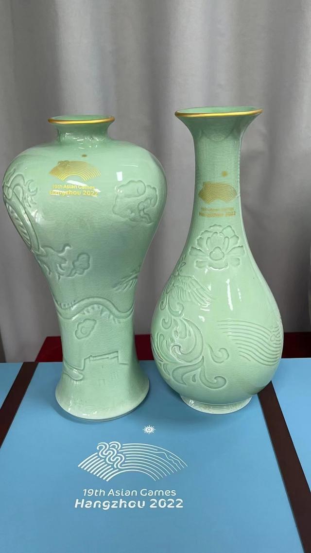 《龍鳳對瓶》由中國工藝美術(shù)大師、享受國務(wù)院特殊津貼專家、國家級非物質(zhì)文化遺產(chǎn)代表性項目汝瓷燒制技藝傳承人李廷懷創(chuàng)作設(shè)計。李廷懷介紹說,《龍鳳對瓶》包含《龍行天下》和《鳳舞九天》兩件作品,《龍行天下》以梅瓶為器型,瓶身雕刻代表1990年北京亞運會的長城、騰飛的巨龍和朵朵祥云,寓意龍騰盛世、平安吉祥;《鳳舞九天》以玉壺春瓶為器型,瓶身雕刻代表2010年廣州亞運會的五羊、翱翔的鳳凰和盛放的牡丹,寓意鳳鳴祥和、富貴榮華。兩件作品均雕刻有杭州亞運會的賽道、錢塘江等元素,將3屆亞運會完美串聯(lián),以此見證中國亞運賽事不斷發(fā)展的30年。《龍鳳對瓶》是一套將中國汝瓷文化、吉祥文化和亞運文化相結(jié)合的、具有時代意義的作品。