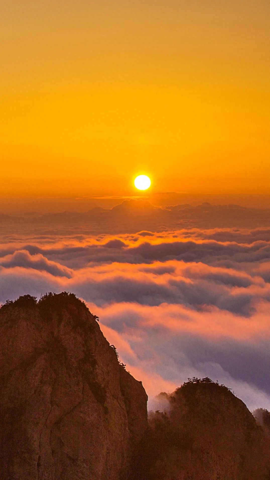 橘色的霞光染紅整片天空,云海、日出、霞光和若隱若現(xiàn)的山林,構(gòu)成一幅“旭日東升”的壯觀景象。