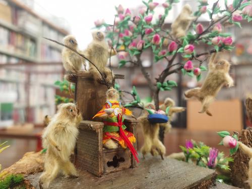 在李宏超制作的一件件不同主題的精美作品中,“毛猴”或圍坐讀書,或打著雪仗,或上樹摘桃,方寸間濃縮世間百態(tài)。李宏超說,前段時間,他帶著自己制作的“西游記”“二十四節(jié)氣”主題作品去新加坡參展,不少外國友人看了連連贊嘆。