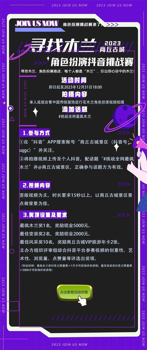 商丘古城文旅集團(tuán)還發(fā)起了2023商丘古城抖音短視頻變裝挑戰(zhàn)賽之“尋找木蘭”角色扮演挑戰(zhàn)賽,按要求參賽即有機(jī)會(huì)瓜分萬(wàn)元大獎(jiǎng)!