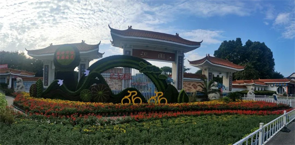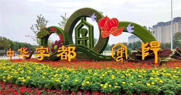 移步文峰大道和光明路東南角,長17米,高6.5米的“中華字都·安陽”主題花壇矗立在迎賓公園南廣場,花壇以兩個高大相切的圓環(huán)為主景,大圓環(huán)中間采用甲骨文“字”形做造型,凸顯甲骨文之鄉(xiāng)和中國文字的發(fā)源地特色。圓形自古就代表吉祥,寓意著圓滿、滿足,所以圓形深受中國人民的喜歡;兩個圓環(huán)如同兩個巨大的歷史車輪,承載著安陽三千年的厚重歷史底蘊滾滾向前,為安陽留下了無數(shù)印記的同時向著美好的憧憬飛奔而去。圓環(huán)下部搭配的牡丹、燈籠、白鴿等造型相組合,寓意著在黨的正確領(lǐng)導下,我們偉大的祖國山青水綠天更藍,人民生活步步高,我們揚起勝利的風帆向著中華民族偉大復(fù)興乘風破浪。