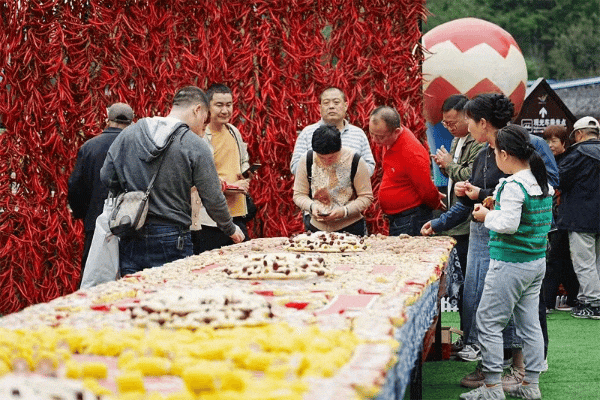 雞冠洞舉行美食山貨免費(fèi)品嘗活動,15米左右的長條桌子上,玉米、核桃、大棗、板栗、花生以及具有豫西獨(dú)特風(fēng)味的棗花饃拼湊成“慶中秋 迎國慶”,這些美食寓意五谷豐登、健康平安,供游客免費(fèi)品嘗,引得前來游覽的游客連連叫好。