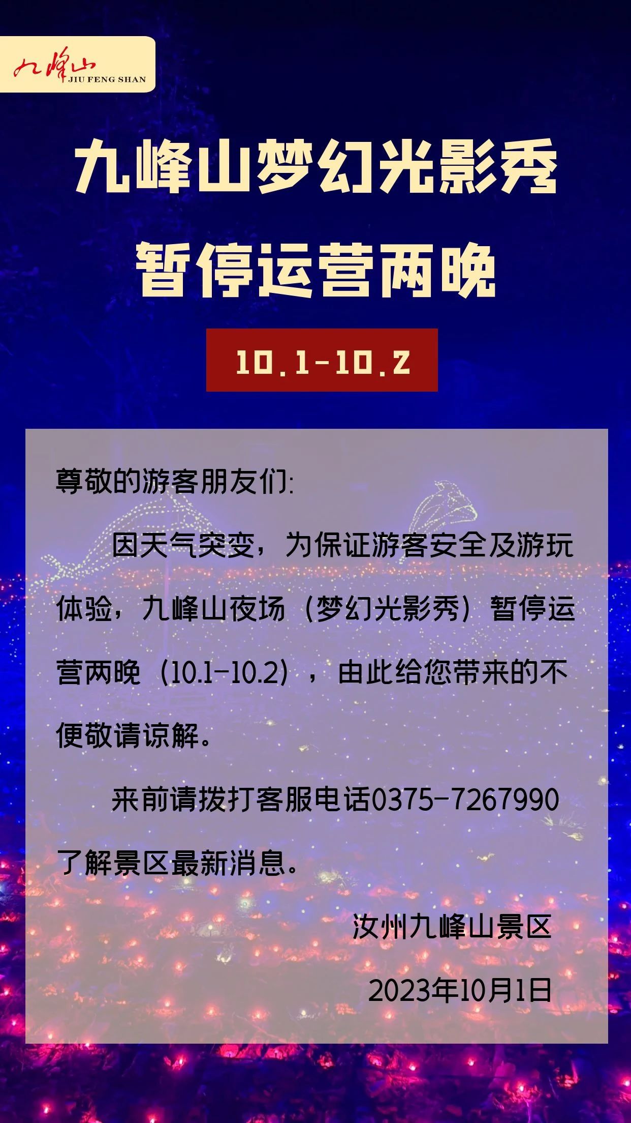 今晚九峰山夢幻光影秀暫停運營