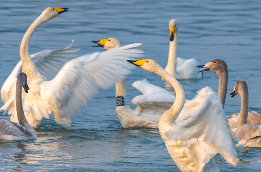 在三門峽市天鵝湖國家城市濕地公園越冬的白天鵝。