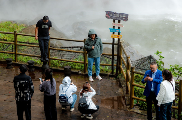 但要說精彩景致,還要看九龍大峽谷。節(jié)前的降雨再次讓峽谷中瀑布水量增大,為雙節(jié)期間到訪的游客朋友們帶來一場“飛流直下三千尺,疑是銀河落九天”的瀑布盛景。