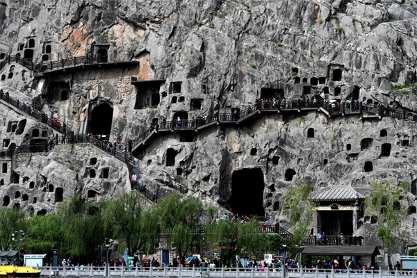 龍門山色位居洛陽八大景之首,唐代詩人白居易曾贊嘆:“洛都四郊,山水之勝,龍門首焉。”想象一下,在唐代的一個晴朗的日子里,伊河波光瀲滟,兩岸綠柳成蔭。游人來到龍門,仰望東西兩山,千巖競秀,萬木爭榮,漫山洞窟如蜂房燕窩,真是一派山水勝境。