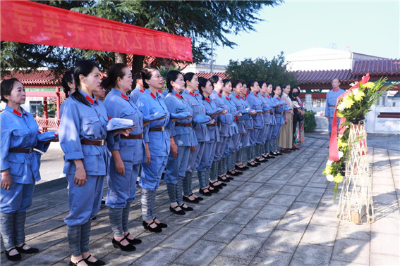 在商城縣烈士陵園,藝術(shù)團成員為革命烈士紀念碑敬獻了花籃,參觀了商城縣革命烈士紀念館,當來到“八月桂花遍地開”紀念展板前,他們不約而同激情澎湃地唱起了這支經(jīng)典革命歌曲。