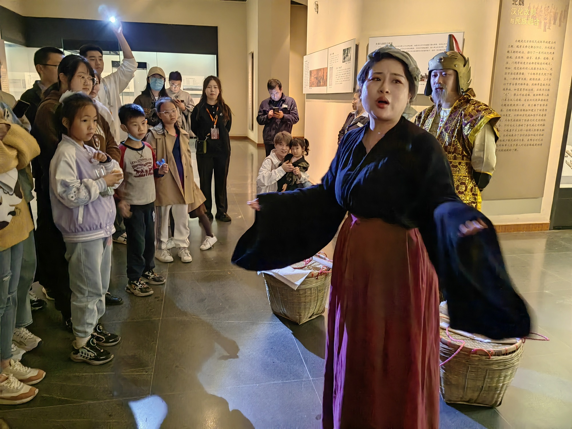 除了洛陽(yáng)博物館的沉浸式講解活動(dòng),在洛陽(yáng)古墓博物館,由專業(yè)講解員精心打造的互動(dòng)式深度講解也收獲好評(píng)無(wú)數(shù)。從倚門(mén)仕女圖到胡人牽駝壁畫(huà),從墓葬形制到建筑特色,身著宋制漢服的講解員仿佛文物的“代言人”,用接地氣、通俗易懂的語(yǔ)言和方式,帶領(lǐng)游客循序漸進(jìn)感受歷史的魅力。