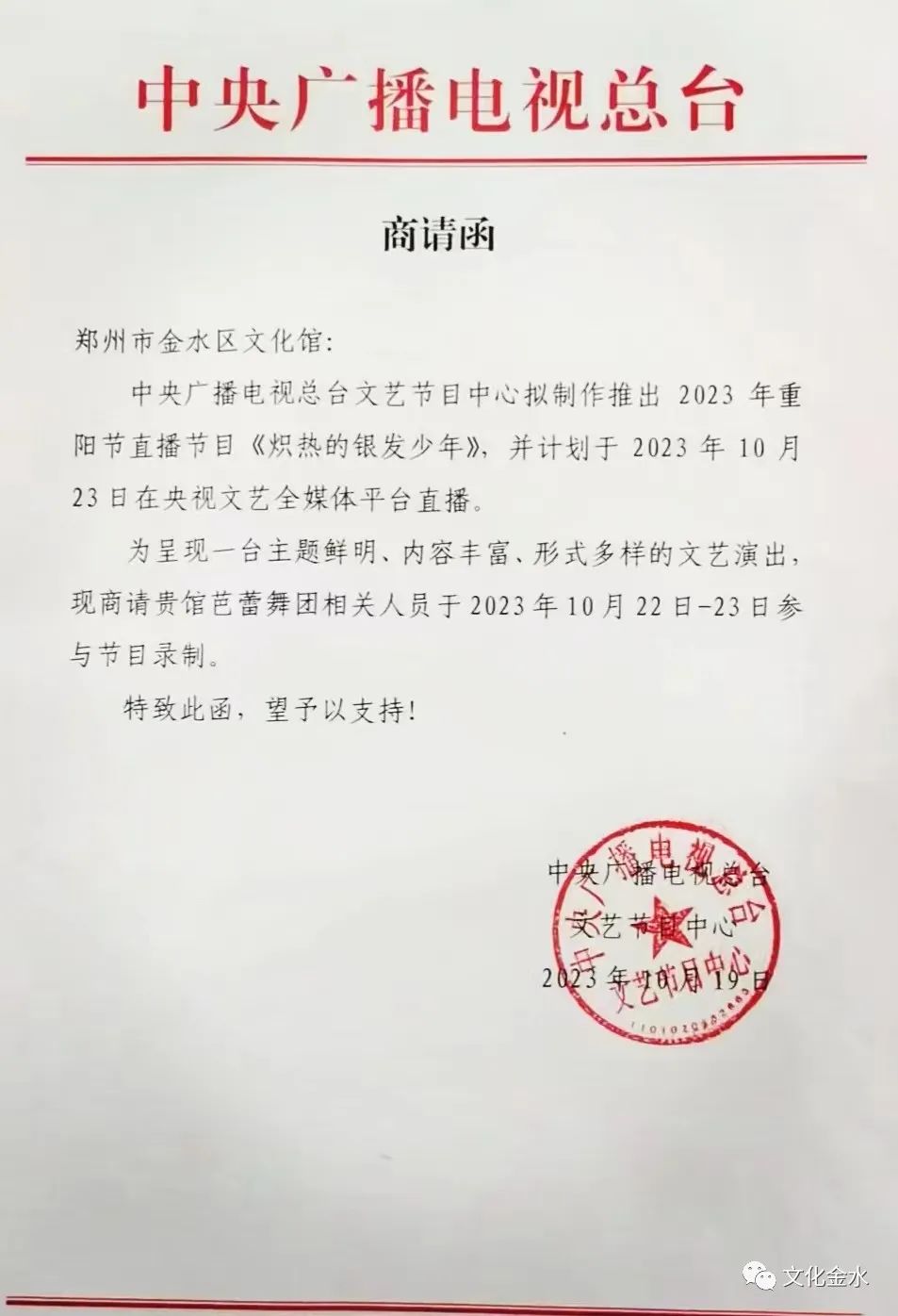 10月19日,金水區(qū)文化館收到了一封邀請函,原來,金水區(qū)文化館芭蕾舞團(tuán)被中央廣播電視總臺文藝節(jié)目組選中,受邀赴京參加《熾熱的銀發(fā)少年》排練及現(xiàn)場直播!