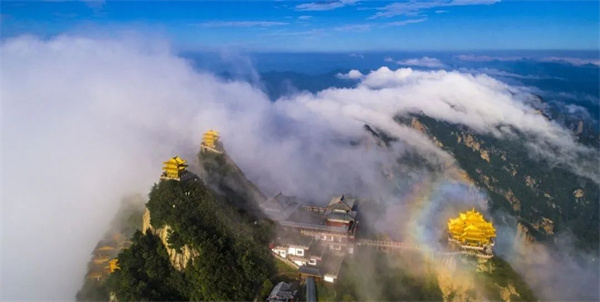 秋天的老君山,鉛華洗盡、返璞歸真,就像老子留下的五千箴言。那深綠環(huán)繞中紅葉點綴的山峰,遠(yuǎn)遠(yuǎn)望去,素樸而又不失簡約。若是有幸趕上雨后的云海,馬鬃嶺在云霧中若隱若現(xiàn),折射出金頂?shù)烙^如神光護體,萬道金光,宛如仙境!