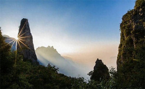 秋天的關(guān)山仿佛更是一副山水畫,綠的水,紅的葉。特別是清晨,云霧縹緲于半山腰間,陽光探出頭,穿過石柱峰,金光乍現(xiàn)、如夢如幻。還有那調(diào)皮的關(guān)山猴在你身邊擠眉弄眼嘰嘰喳喳和你要吃的喝的。秋天來了,紅葉來了,去赴一場關(guān)山酒吧。