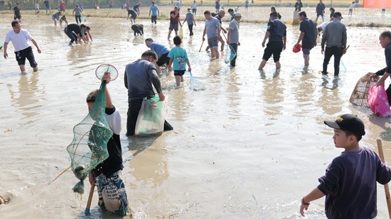 隨著活動(dòng)的重頭戲下田摸魚開始,現(xiàn)場的大人、小孩脫下鞋,卷起褲腳,拿起工具,紛紛涌向規(guī)定區(qū)域動(dòng)手捕魚捉魚,感受摸魚的樂趣,享受田園風(fēng)光和親子陪伴的樂趣。