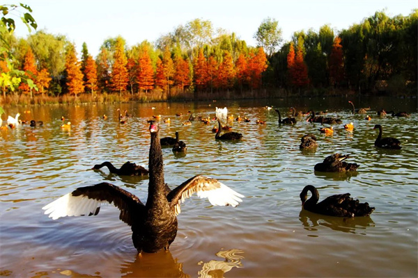 成群的黑天鵝在波光粼粼的湖面