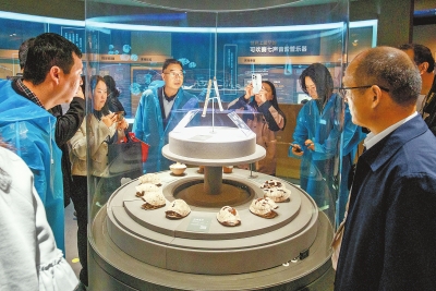 游客在展廳參觀賈湖骨笛。楊光 攝