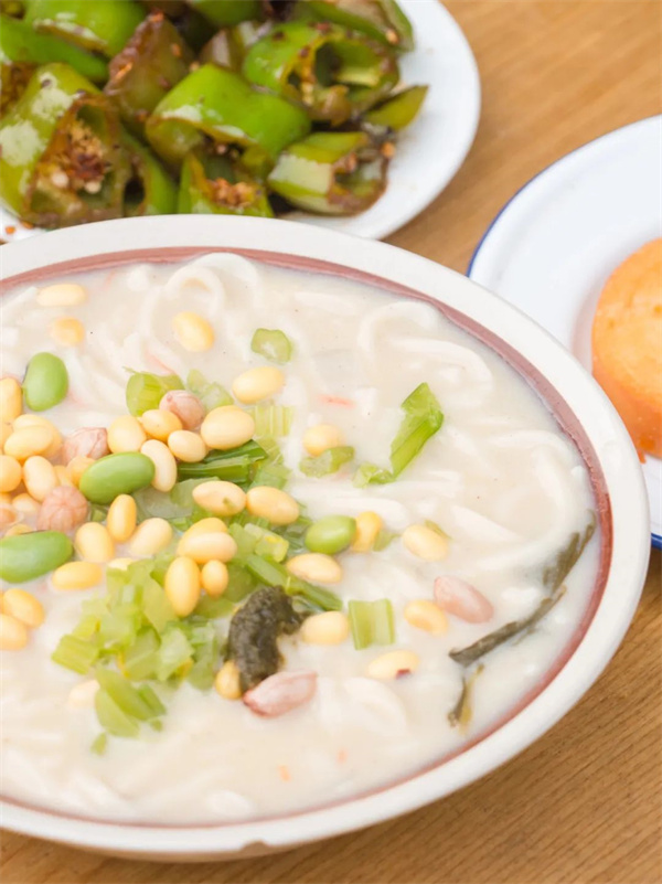 取一把綠豆或者豌豆,泡軟磨碎,讓其發(fā)酵泛酸,把花生黃豆煮熟,加入切好的鮮芹菜丁,鹽、雞精、蔥姜蒜爆香,倒入漿水煮面,撈起加入紅蘿卜絲等配料,便是連劉秀都贊不絕口的洛陽(yáng)漿面條。如果再能配上一碟蘿卜咸食,一碟油炸饃片,那就是人間至味,人生清歡。