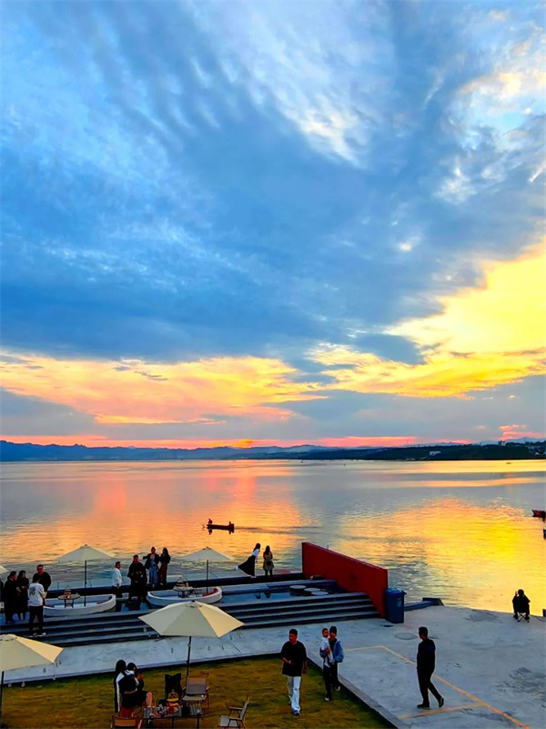 暮色暗淡,帳篷、樹枝、房屋如鑲金邊,抬頭望去如夢(mèng)似幻。在萬安山看日落,是一件極其浪漫的事。隨著時(shí)間流逝,一抹殘陽(yáng)將遙遠(yuǎn)的天際涂成橙紅、深紫、灰藍(lán),連綿的山巒成了一幅水墨畫,余暉打在山巒上的陰影不斷流轉(zhuǎn)。
