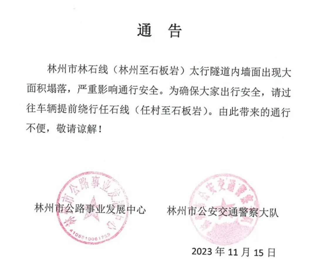 林州市林石線(林州至石板巖)太行隧道內(nèi)墻面出現(xiàn)大面積塌落,嚴(yán)重影響通行安全。為確保大家出行安全,請(qǐng)過(guò)往車輛提前繞行任石線(任村至石板巖)。由此帶來(lái)的通行不便,敬請(qǐng)諒解!