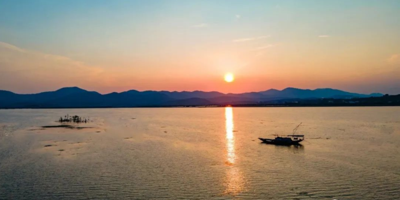 寬廣的江面上偶有漁船劃過(guò),船槳翻轉(zhuǎn)間,浪花層疊而起,激出水面下潛藏的魚兒。漁民打著槳,和著浪花的水聲,悠悠然蕩漾在這水天一色之中。沿岸的漁民在這里世代而居,依水而興,將這片江水視為自己的另一個(gè)“親人”。