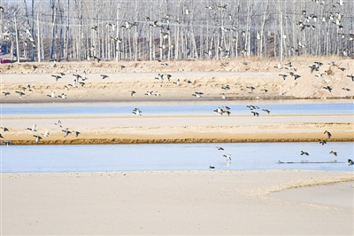 隨著生態(tài)環(huán)境向好,加上地方林業(yè)部門的全力呵護,黃河濕地已成為適宜鳥類居住的“樂園”,吸引了小天鵝、銀鷗、綠頭鴨、赤麻鴨、斑嘴鴨等越冬鳥類光臨。它們時而在水面嬉戲、覓食,時而在水面上空飛舞盤旋,甚是熱鬧。