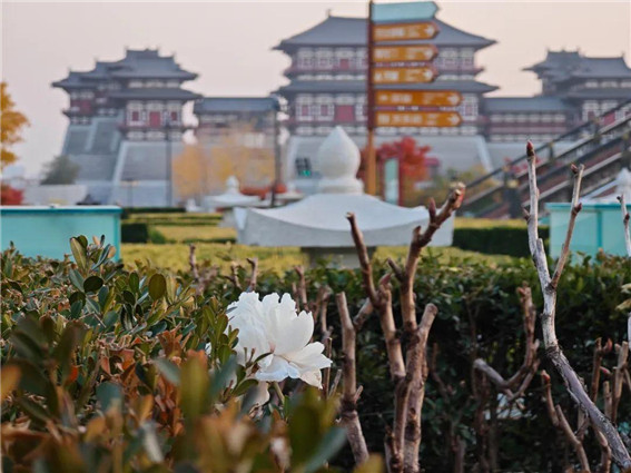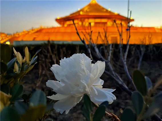 洛陽明堂景區(qū)內,一株白牡丹在冬日盛開。