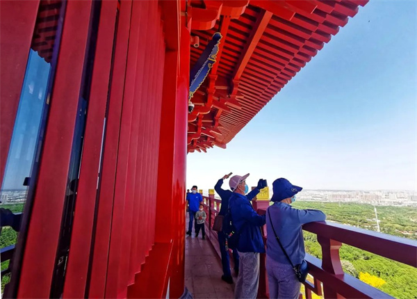 但當(dāng)你站在觀光層向北望去,還可以看到洛陽(yáng)市中心城區(qū)的全景及城市現(xiàn)代軸線;向東可以遠(yuǎn)眺嵩山,俯瞰龍門,看到伊水穿城而過;向南可望見伏牛山層巒疊嶂,雄偉厚重;向西望去,遠(yuǎn)方的香麓山風(fēng)光盡收眼底……