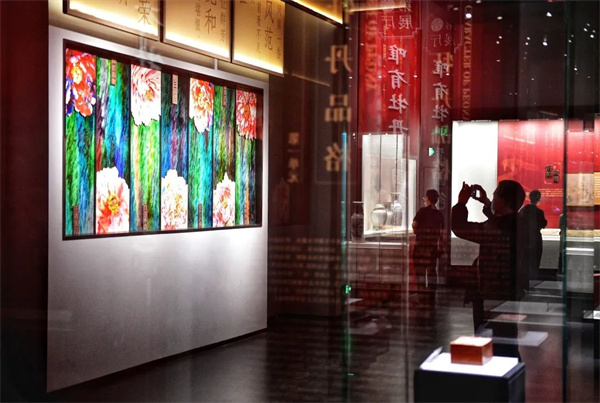 在牡丹博物館內(nèi)色彩豐富的琉璃中,九朵造型各異的描金牡丹競(jìng)相開放。雍容華貴的牡丹與玲瓏剔透的琉璃交相呼應(yīng),牡丹博物館憑借著“高顏值”的建筑與藝術(shù)風(fēng)格吸粉無數(shù)。