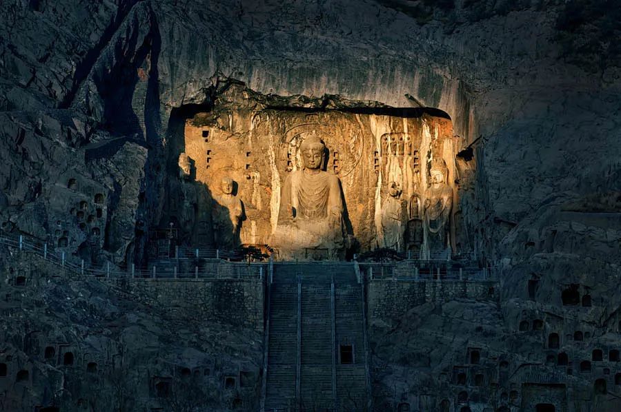 伴隨著初冬陽光的緩緩升起,金燦燦的陽光灑在奉先寺盧舍那大佛的身上,剎那間,大佛綻放著萬丈光芒,放眼望去佛光普照、熠熠生輝,更加凸顯了盧舍那大佛無與倫比的莊嚴與美麗。
