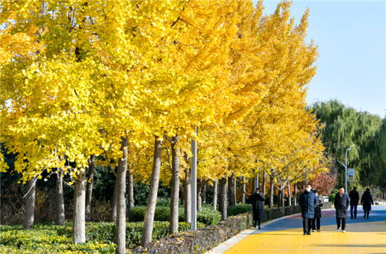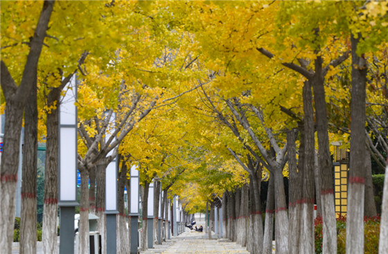 湖西游路及林蔭廣場(chǎng)上,種植有300余株樹(shù)齡30年左右的銀杏樹(shù),目前也已是金黃一片。