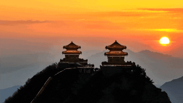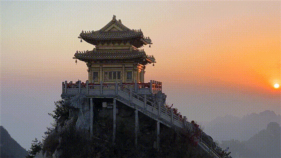 當(dāng)夜幕降臨,夕陽的余暉逐漸消散,暮色四合,華燈初上,老君山像是變了裝一樣,暖黃色的線條將金頂?shù)烙^群勾勒出溫暖的色調(diào)。