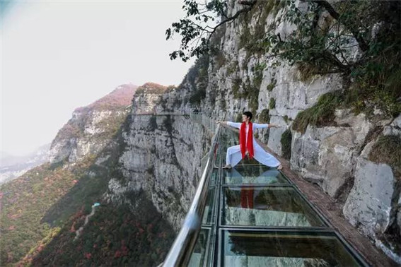漫步全長520米,玻璃路面131.4米的青天河玻璃棧道,在懸崖峭壁之間,感受風(fēng)穿過指縫的清爽,暢享初冬山間的愜意。