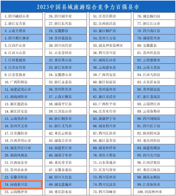 會上,國內(nèi)著名縣域旅游研究機構(gòu)競爭力智庫和北京中新城市規(guī)劃設(shè)計研究院發(fā)布《中國縣域旅游競爭力報告2023》,揭曉了2023中國縣域旅游綜合競爭力百強縣市,洛陽欒川縣榜上有名,位居24位,較2022年提升4位。
