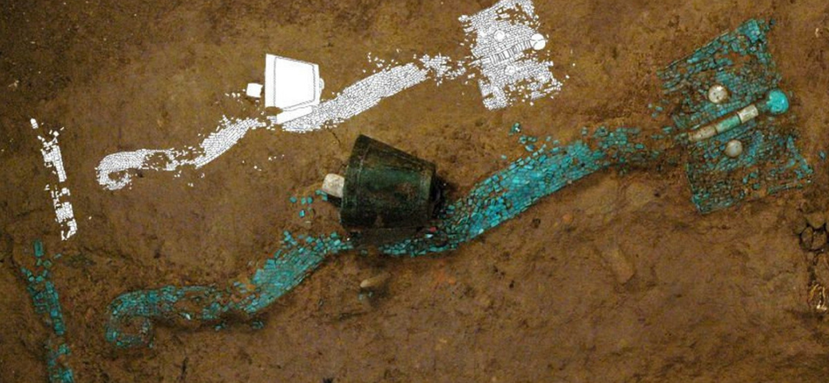 “龍辰辰”的鼻子從出土于河南偃師二里頭遺址的綠松石龍形器中提取獨具上古特色的設計元素,綠松石龍形器巨頭蜷尾、鼻頭突出、身軀起伏有致,仿佛正在蓄力向天騰躍,形象鮮活生動,是中華民族龍圖騰的代表性實物,整體長64.5厘米,由2000余片形狀各異的綠松石細片拼合而成,每片大小僅有0.2—0.9厘米,厚度0.1厘米左右,用工之巨、制作之精、體量之大,在中國早期龍形象文物中十分罕見。眉弓和龍肩上的裝飾取自河南博物院收藏的云紋銅禁紋飾,精美別致,增添了吉祥物的趣味和古韻。