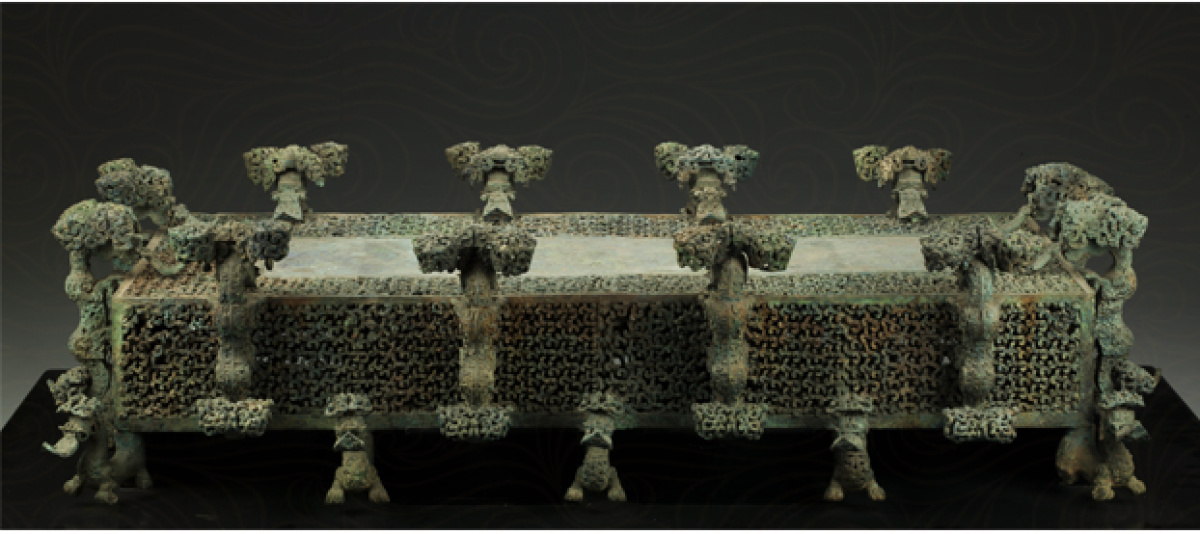 云紋銅禁出土于河南淅川下寺春秋楚墓,它的主人是“問鼎中原”的楚莊王之子,器物本身處處彰顯著“大國制造”的實力,粗細不一的銅梗,如編織中國結一般筑成銅禁禁體的朵朵“云彩”,銅禁禁體四周的12條龍形獸昂首吐舌、挺胸凹腰,器物造型奇特,工藝復雜精湛。專家認為云紋銅禁是目前發(fā)現(xiàn)的時代最早的失蠟法鑄件,對研究古代科技意義重大,展現(xiàn)了中國傳統(tǒng)紋樣藝術的魅力。