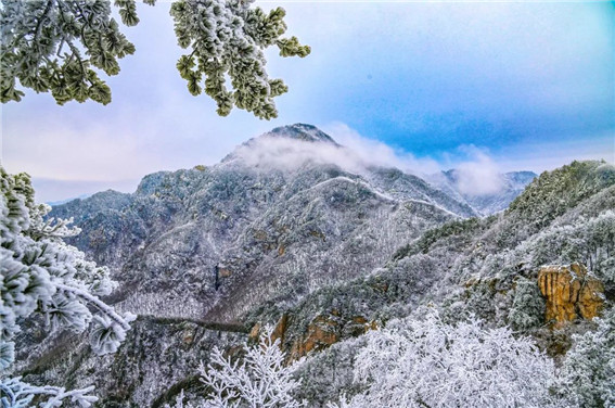 平均海拔超過1100米的天界山,初冬時節(jié),遠(yuǎn)山近樹,云霧繚繞,掛滿晶瑩剔透的霧凇,猶如水墨畫卷。