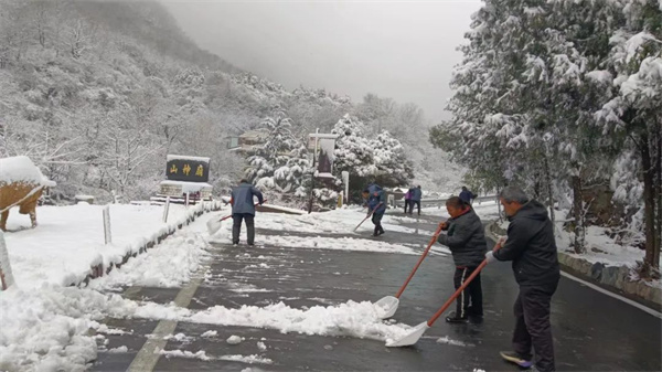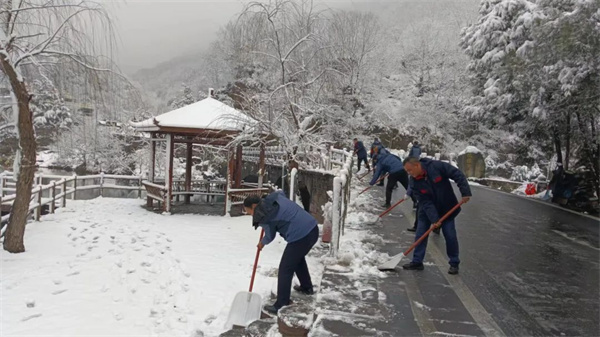 大雪將山巒峰谷銀裝素裹,景色頗為壯觀。但持續(xù)的降雪也給通行帶來了困難,景區(qū)領導帶頭組織員工頂嚴寒、冒大雪開展掃雪除冰行動。確保景區(qū)道路暢通,重要設施設備安全運行,保障各項工作正常開展。