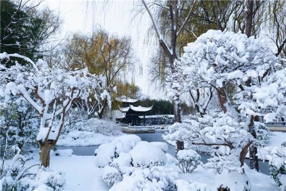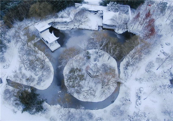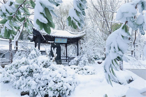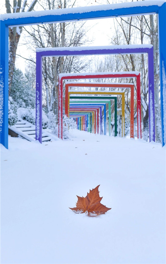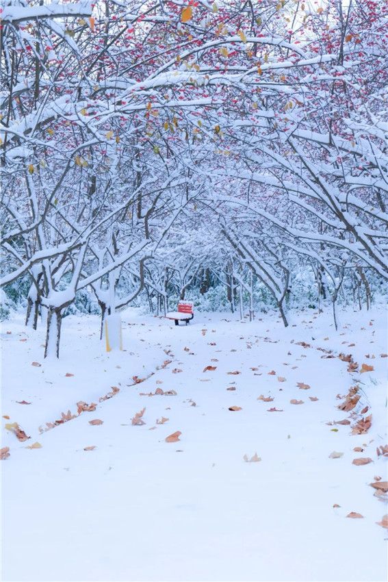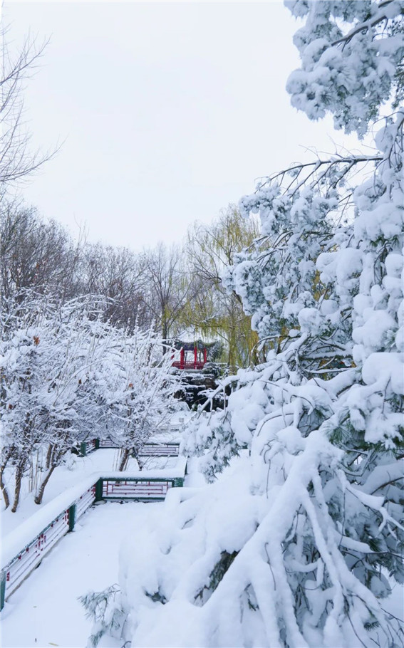 大雪過(guò)后的綠博園,樹(shù)木被積雪裝點(diǎn),色彩斑斕的亭臺(tái)樓閣,在銀色外衣的裝扮下顯得格外大氣耀眼,楓葉在雪的映襯下,更顯得紅艷欲滴,似一幅淡雅的水墨畫(huà),呈現(xiàn)獨(dú)特韻味。