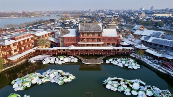 雪花落在紅燈籠、木窗欞上,與傳統(tǒng)中國(guó)味完美融合,詩(shī)情畫(huà)意的隋唐洛陽(yáng)城,在風(fēng)雪中更添柔和秀美。